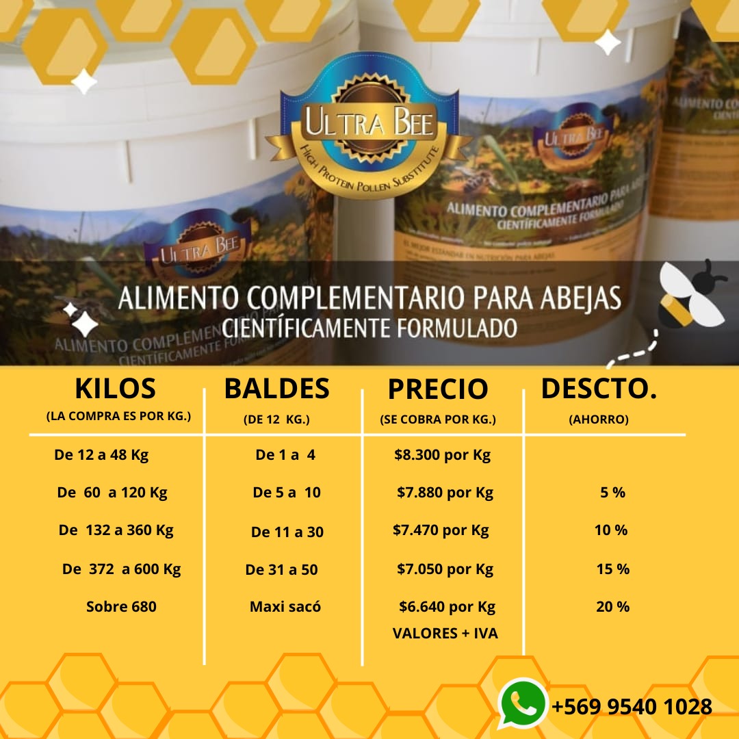 Ultra bee cuenta con un 54% de proteínas mas un perfil completo de aminoácidos, vitaminas, lipidos y minerales.